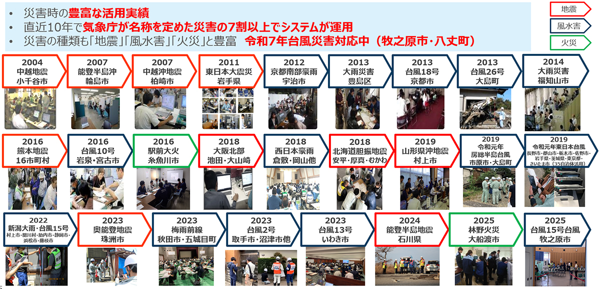 その後、2007 年(平成 19 年)の能登半島沖地震における輪島市や新潟県中越沖地震の柏崎市、2011 年(平成 23 年)の東日本大震災の岩手県、2012 年(平成 24 年)の京都南部豪雨や 2013 年(平成 25 年)の台風 18 号の京都市および 26 号の伊豆大島など、さまざまな地震や水害にて本システムが活用・研究され、これらの研究成果がバージョンアップとして製品に反映されていった。