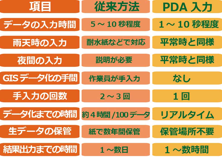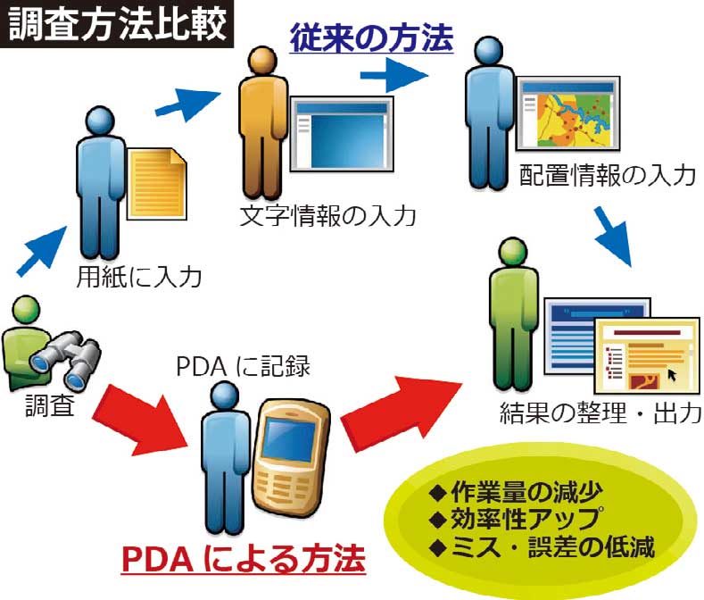 紙からモバイルGISへの移行によって生まれた最も大きな効果は、作業量の効率化である。従来の調査方法では、結果の出力に至るまでに調査用紙への記録、文字情報の入力、位置情報の入力というステップをそれぞれ踏み、同時に多くの作業員を雇う必要があった。