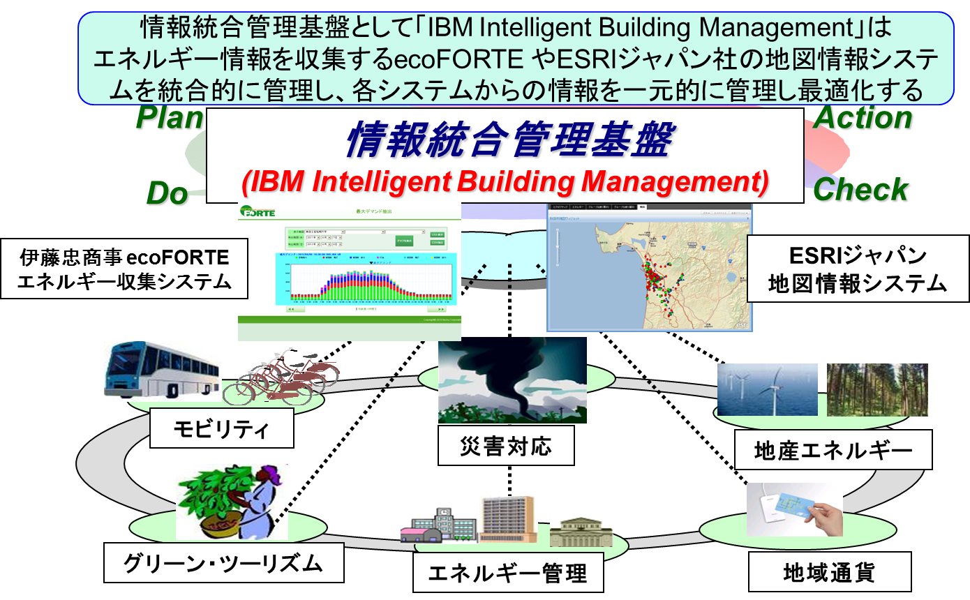 情報統合管理基盤の構築は、全体調整と ArcGIS の実装をアイ・エム・サービス株式会社、クラウドサービスの実装を伊藤忠テクノソリューションズ株式会社、ecoFORTEと呼ばれる、スマートメーターと連動するエネルギーデータ管理システ ムの構築を伊藤忠商事株式会社、そしてエネルギーデータや、地理情報などを集約・統合してダッシュボードに表示するポータルサイト、IIBM(IBM Intelligent Building Management)の構築を日本IBM株式会社がそれぞれ担当した。