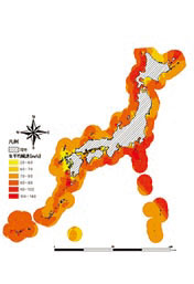 経済産業省所管のNEDO(独立行政法人 新エネルギー・産業技術総合開発機構)では、エネルギー源の非化石化を推進するため、比較的低コストの太陽光や風力発電など再生可能エネルギーの調査研究や補助事業を行っている。風力発電の出力は風速の3乗に比例する。風速が10%高くなると発電量は約30%増して累積の年間発電量は大きく異なってくる。従って、平均風速が高い地点を抽出ために、500mメッシュの風況(LAWEPS)のGISデータ化を行った。さらに、風車建設の制限条件となる自然公園マップや住居、道路などを国土地理院の数値地図(空間データ基盤)と照合して、発電ポテンシャルの高い候補エリアを絞ることに活用している。