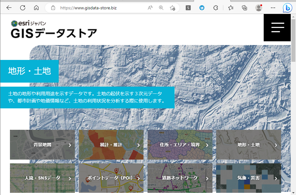 GISデータストアは、ESRIジャパン で公開しているカタログサイトです。ArcGIS で使えるデータ製品を紹介しており、データの仕様やオンラインデモなどを公開しています。また、本サイトからお問い合わせも可能です。