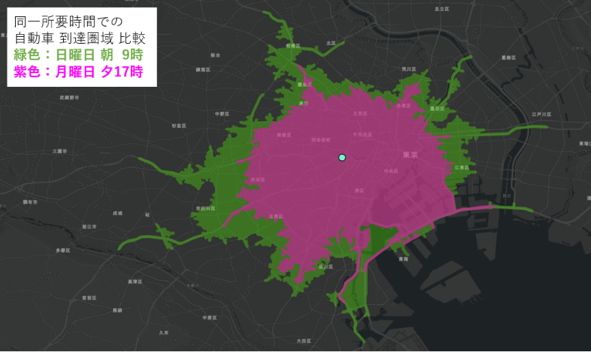 曜日・時間帯における各道路の混雑パターンを考慮した道路ネットワーク解析を可能とします。