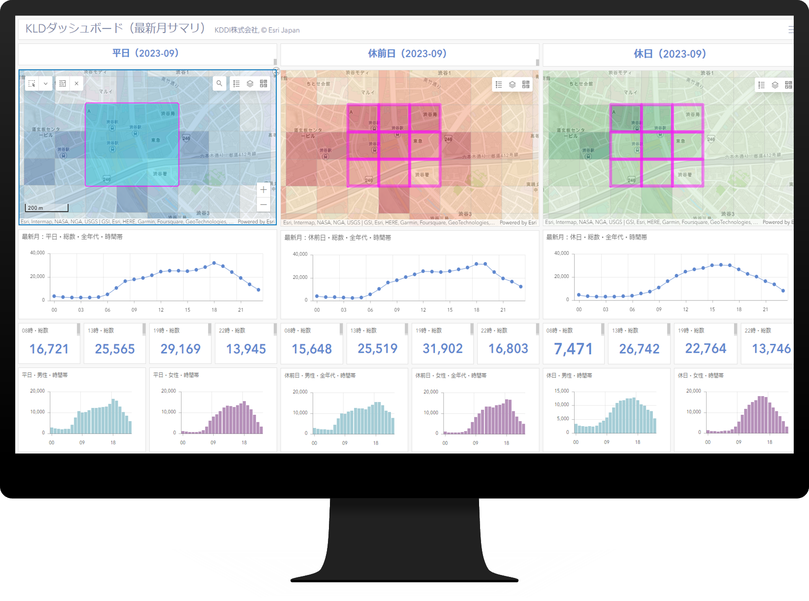 ArcGIS Pro などの高度な GIS ツールからも利用でき、予測分析などの高度な分析の入力データとしても活用できます。また、より詳細なデータは KDDI Location Data のオフライン データとしても販売しています。