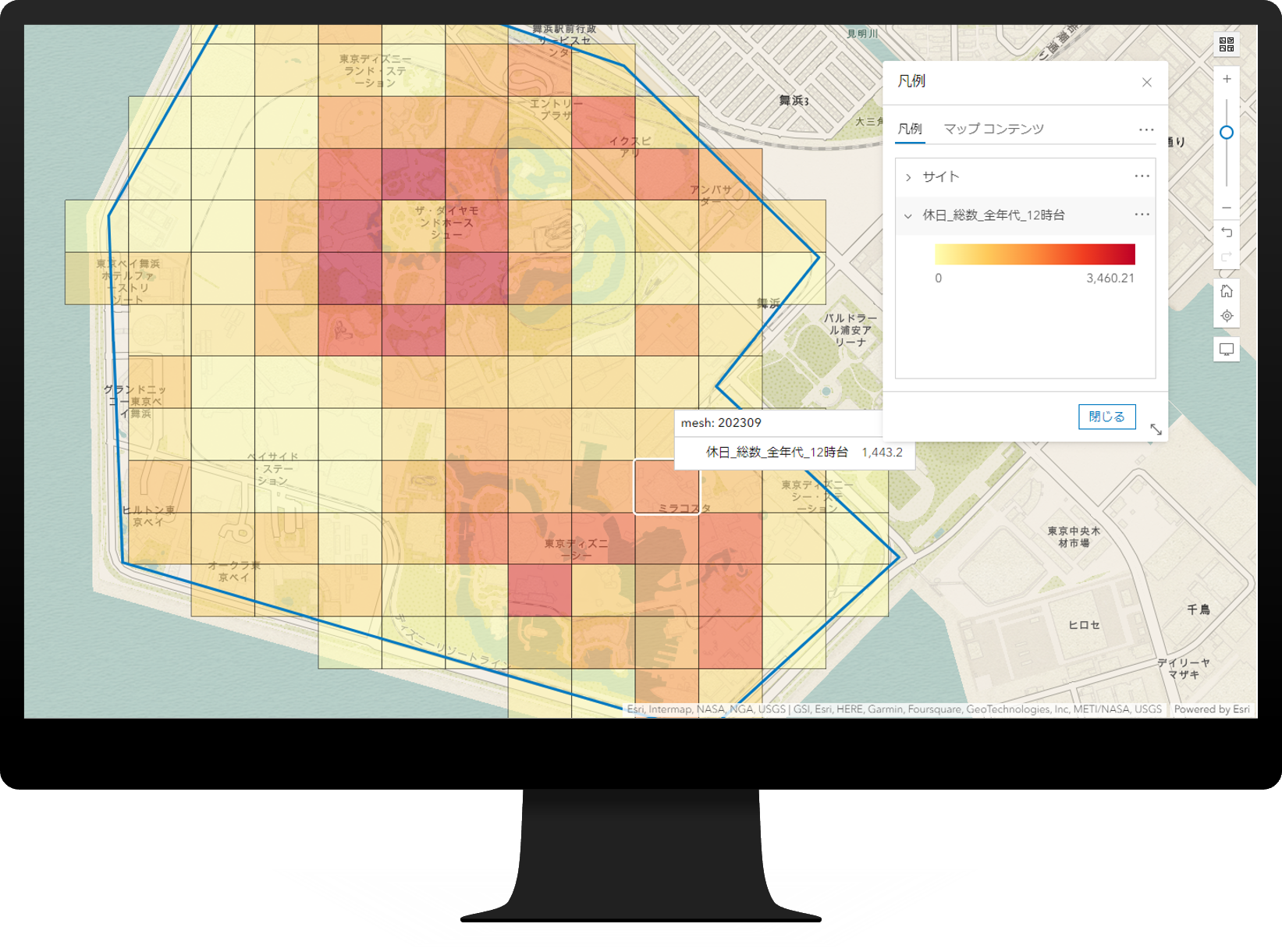 人流データ オンラインサービス (KDDI Location Data 版) (以下、人流オンライン サービス) は、株式会社 KDDI が提供する au スマートフォンから得られる GPS の位置情報 / 属性 (性別・年代) 情報※を基にした人流データを ArcGIS 上で可視化・解析可能な形式で配信します。直近から過去 1 年前までの滞在人口を把握できるため、商圏分析・エリアマーケティング用途だけでなく、防災まちづくりや都市計画、観光分析などに活用できます。