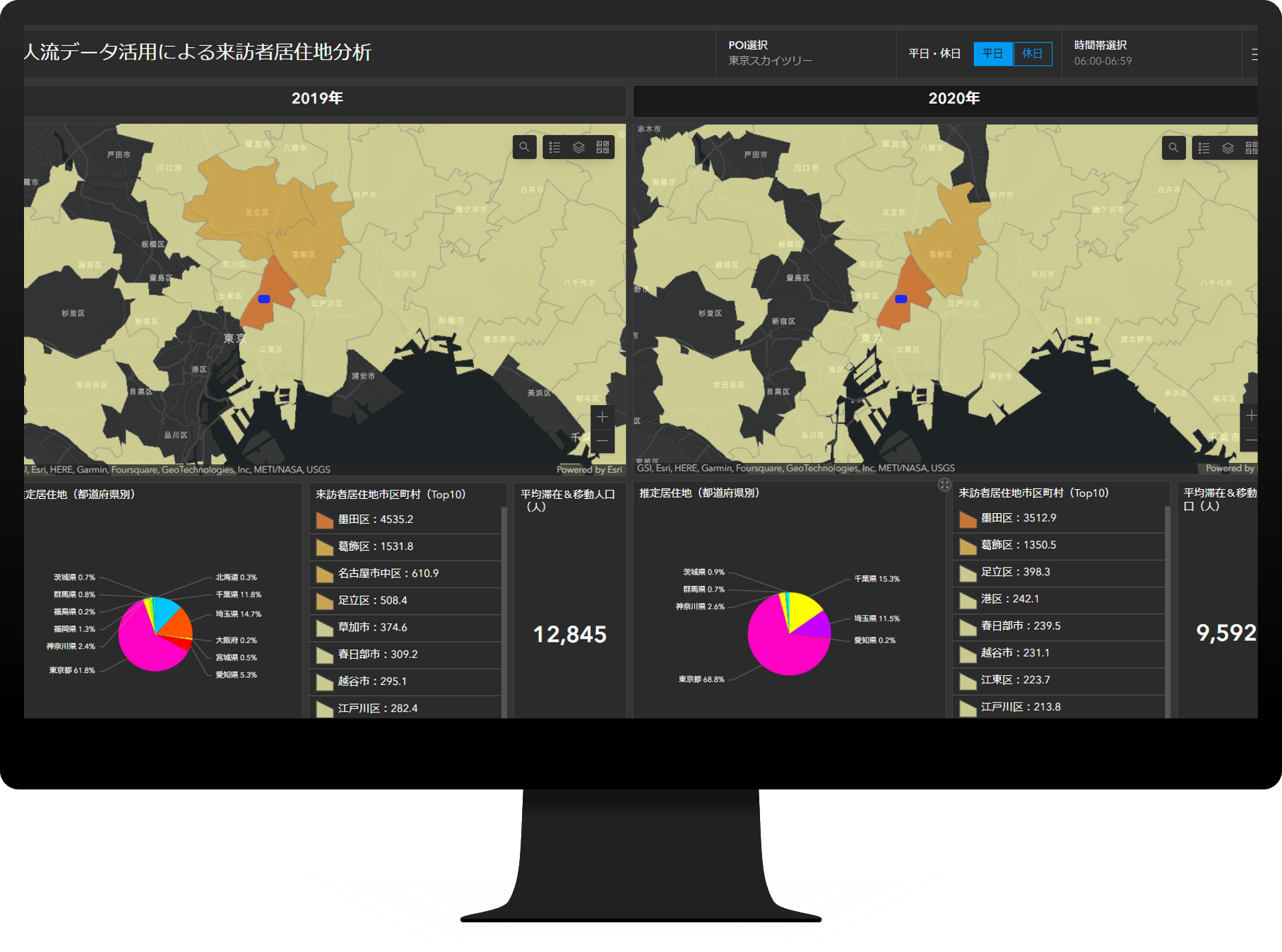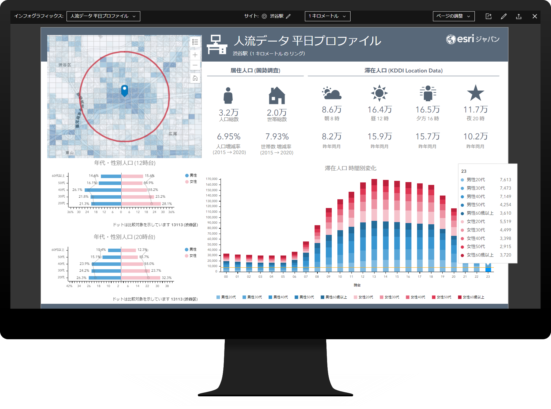 地図上で指定したエリアの滞在人口を性別・年代別にダッシュボード上に表示して分析できます。 ArcGIS は設定のみでダッシュボード上に表示する項目を自由に変更できるため、自組織が着目する情報のみを容易に把握することができます。