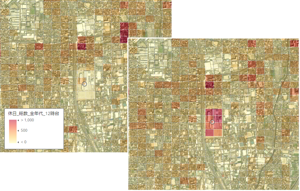 地図上に滞在人口に加えて、自社店舗や競合店舗をプロットすることで、任意の時間帯×属性(性別・年代別)における店舗周辺の人口分布を把握できます。
