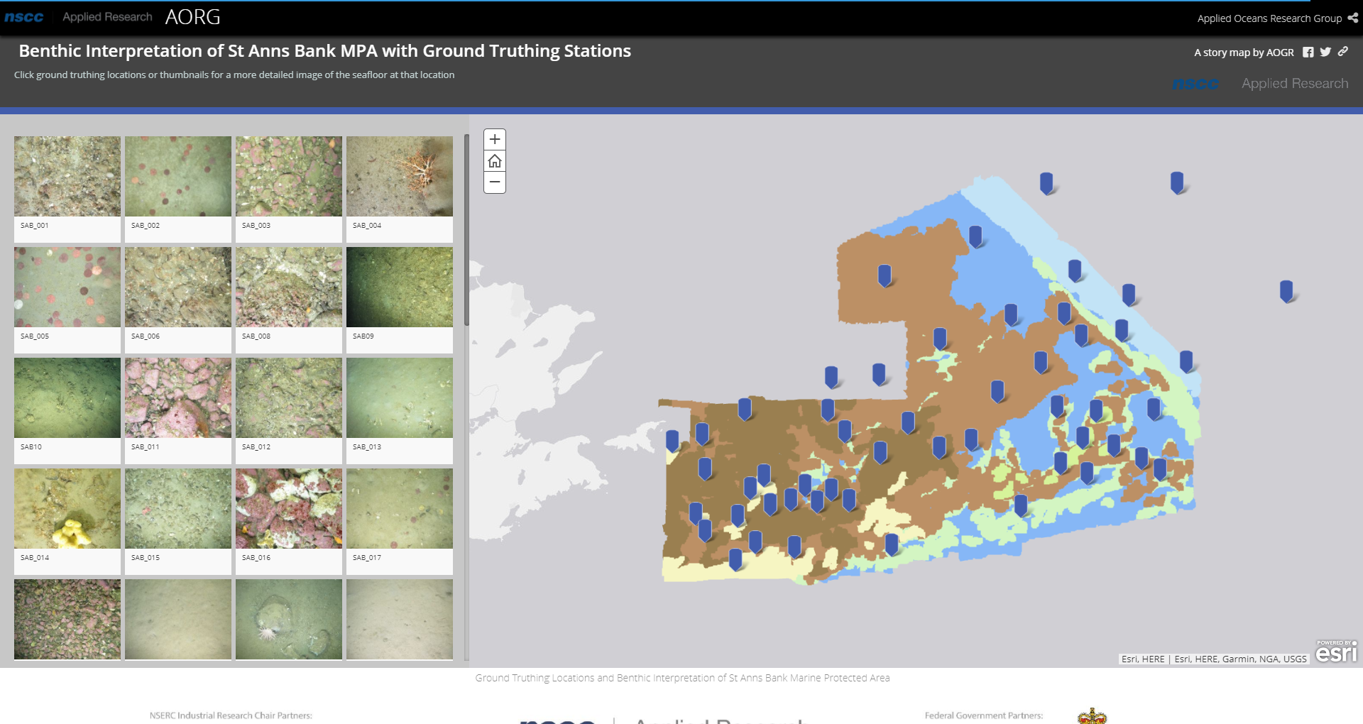 NSCC 作成のカナダ南東部 ケープブレントン島 東にある St. Anne Bank MPA の海底生物の観測位置情報と写真を示したストーリーマップ