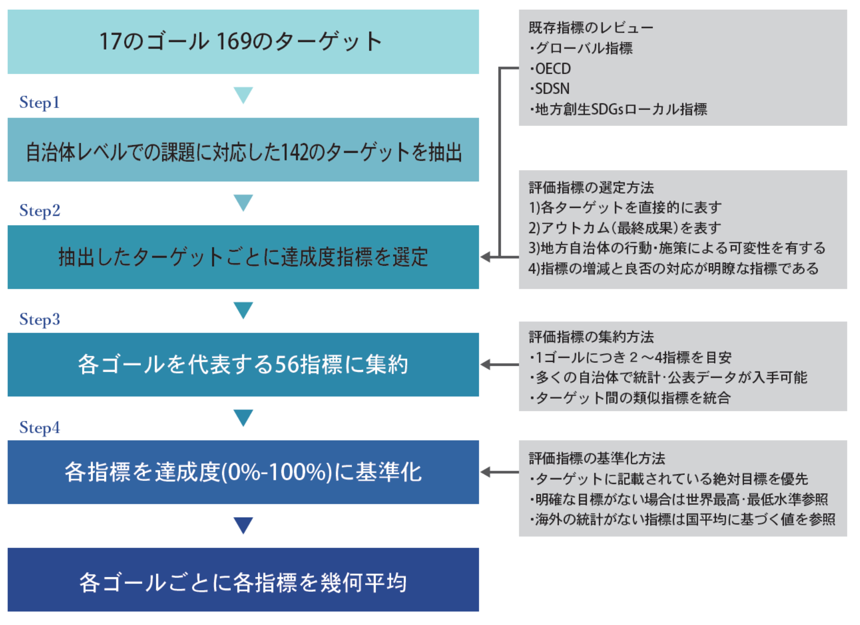 地方自治体におけるSDGsモニタリングの枠組み(左)とSDGs達成度評価指標の作成プロセス(右)