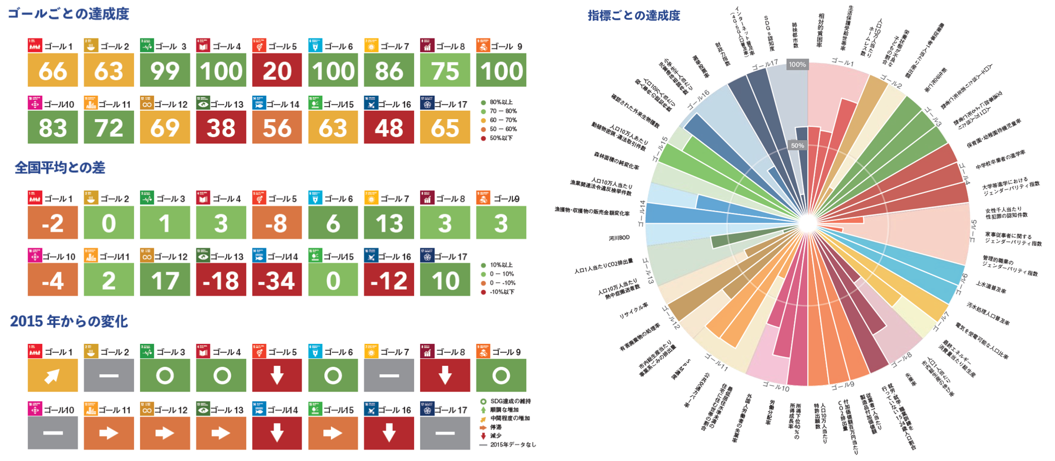 「自治体 SDGs モニタリングの手引き Part A:地域の SDGs 達成度評価」は、地方自治体の現在の SDGs 達成度を 0 から 100 の間でゴールごとに評価し、各地方自治体の強みと弱み、現状と課題を把握することを可能とするツールとしてまとめたものです。開発した評価システムの概要と日本の 47 都道府県における評価結果、そして都市単位でのケーススタディとして、名古屋市および豊田市の評価結果を掲載しています。