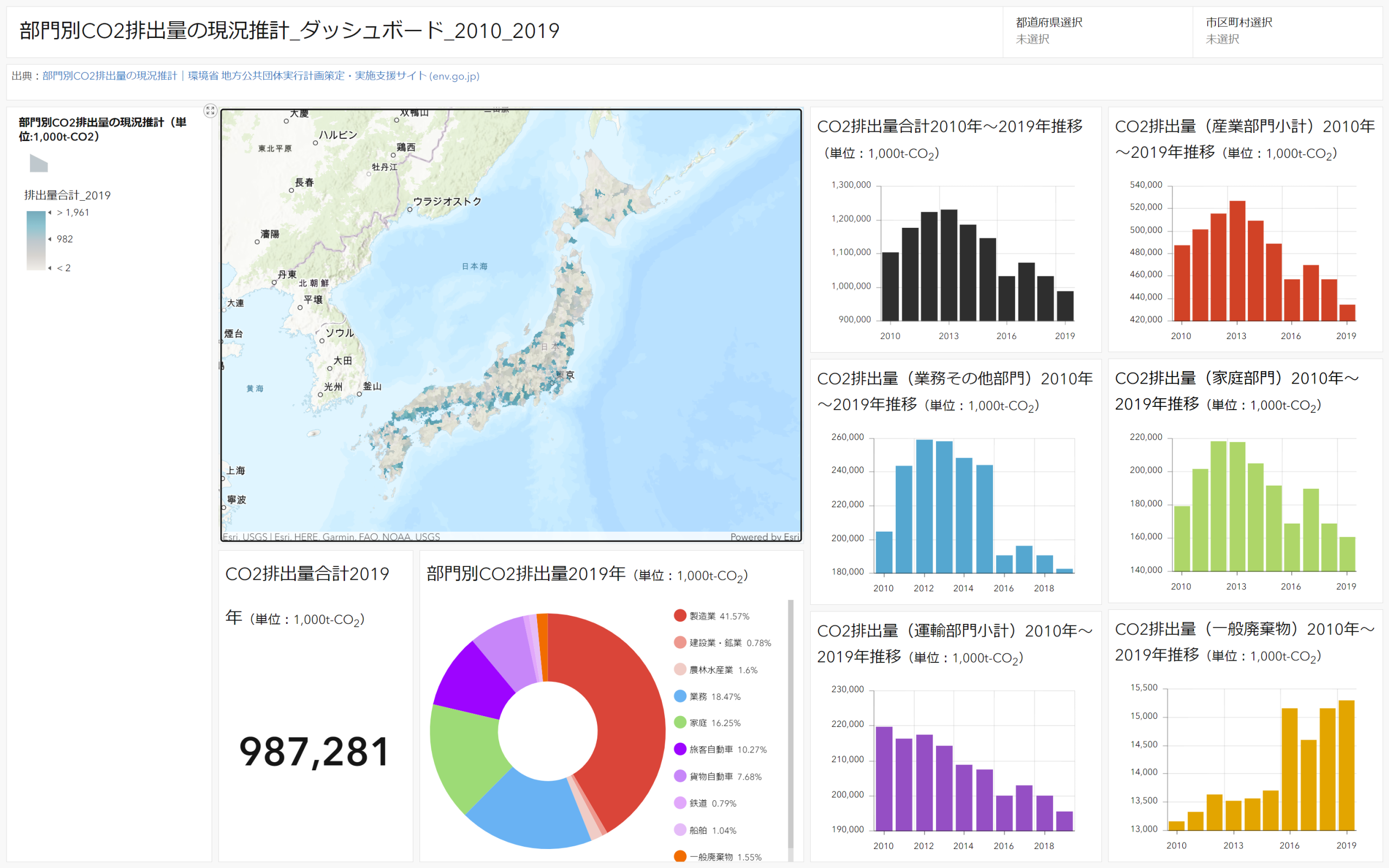 もちろん、これだけでも都道府県ごとの二酸化炭素(CO2)排出量の数値を測ることはできますが、ArcGIS Dashboardsを使うと以下のように可視化できます。