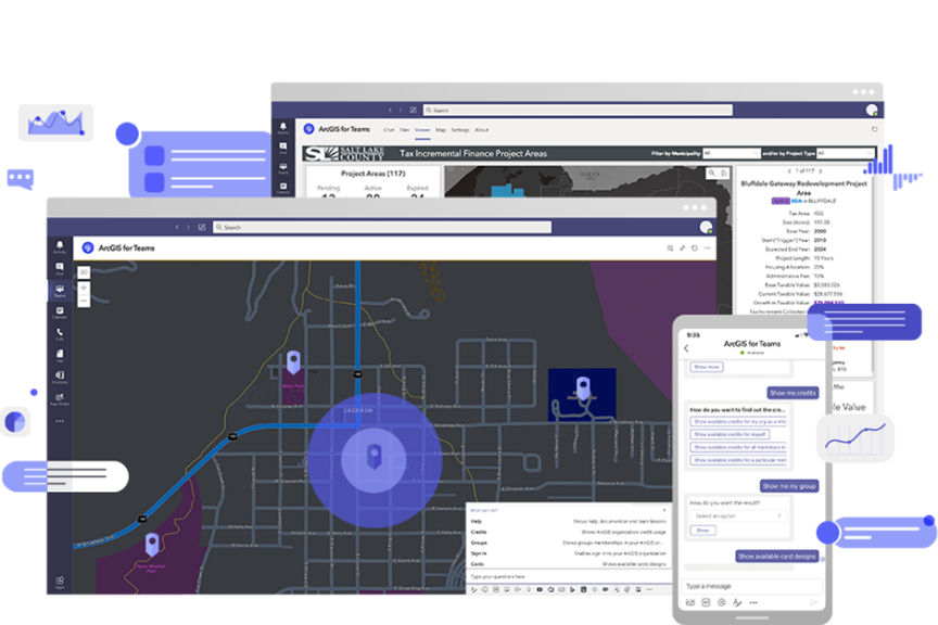 ArcGIS for Teams は、Microsoft Teams でマップやアプリを検索、表示することができる ArcGIS のアドイン アプリです。