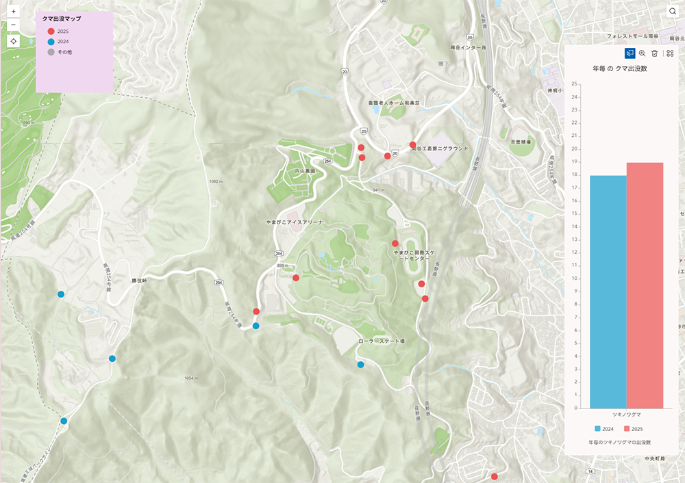 東京都環境局が公開している「TOKYOくまっぷ」では、ArcGIS for Power BI が活用されており、東京都内のツキノワグマの出没情報を地図とデータの両面から視覚的に分析・共有する仕組みが構築されています。