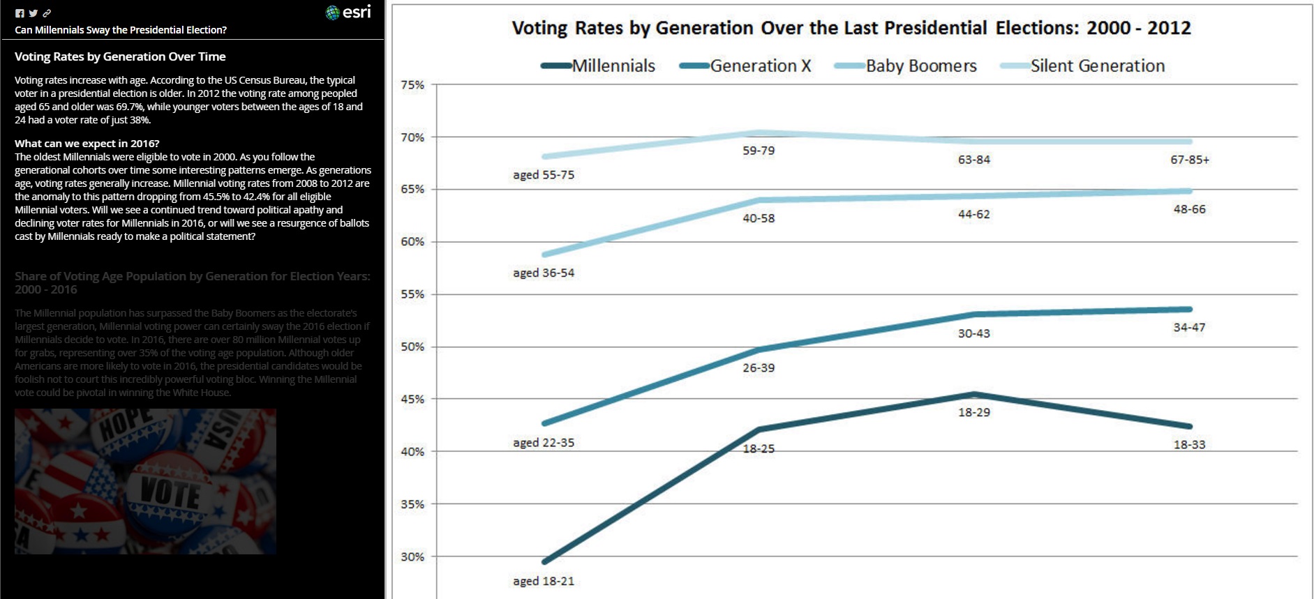 このストーリーマップは、ミレニアルズ世代の州ごとの分布と彼らの政治参加、投票率など、11月の選挙結果に影響を及ぼし得るデータをすべて可視化しています。