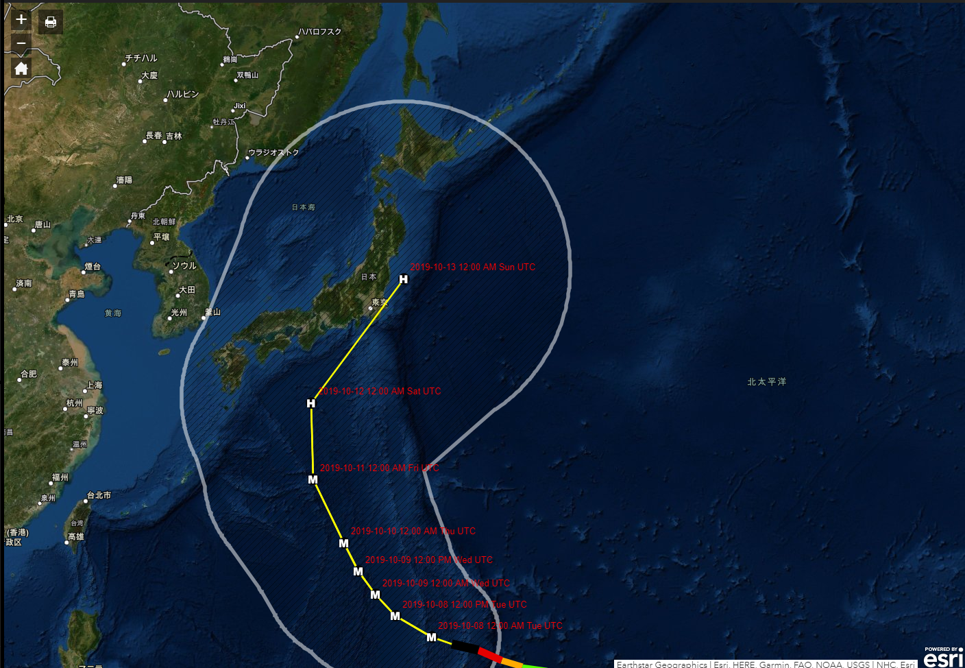 2019年10月08日台風19号予想進路と拠点重ね合わせWebアプリ