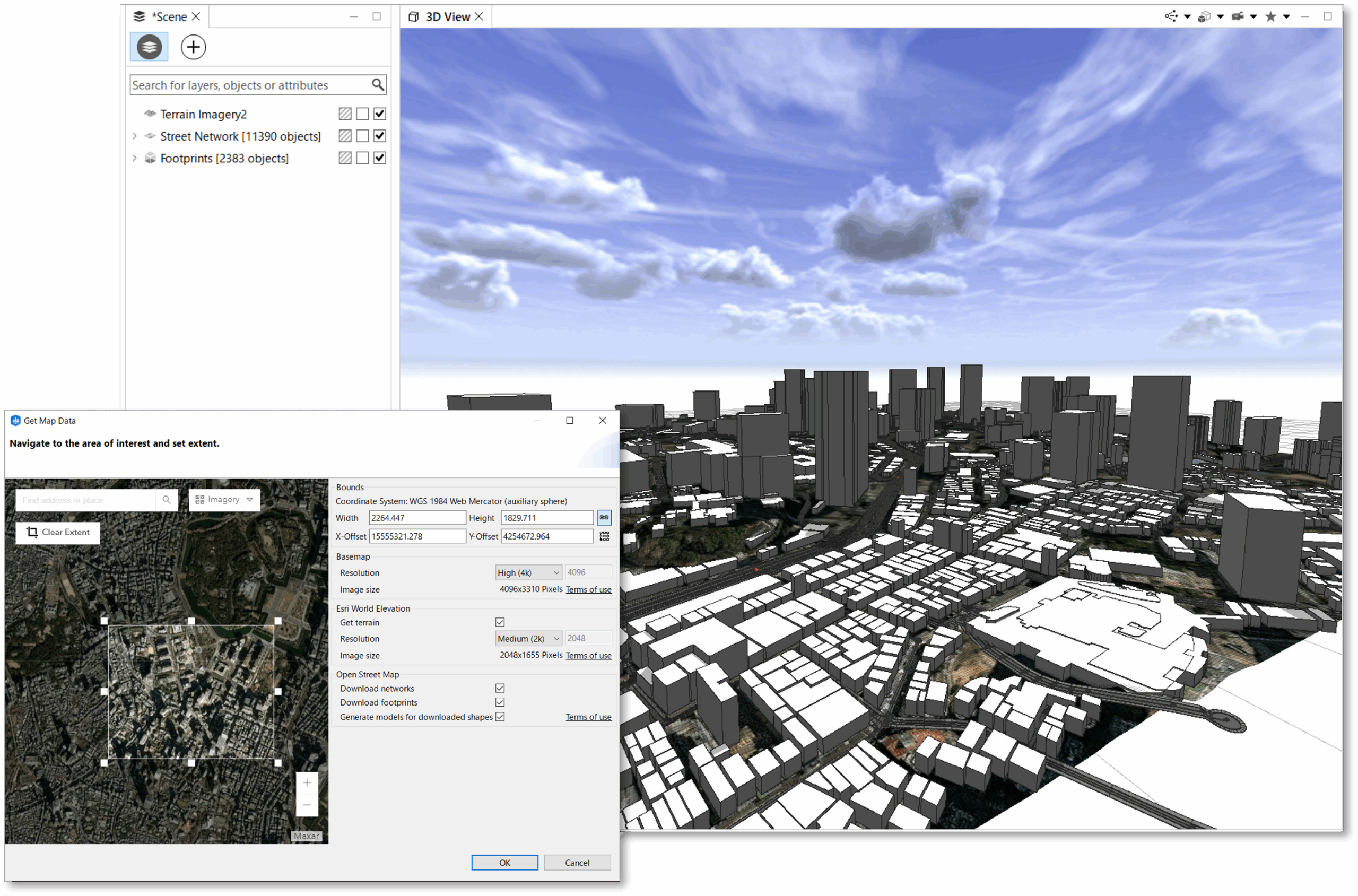 また、Get Map Data 機能では、Open Street Map からデータを切り出し、都市景観を作成することも可能です。