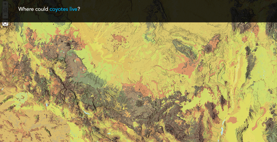 - 濃い緑のエリアがコヨーテの生息に適したエリアです。
