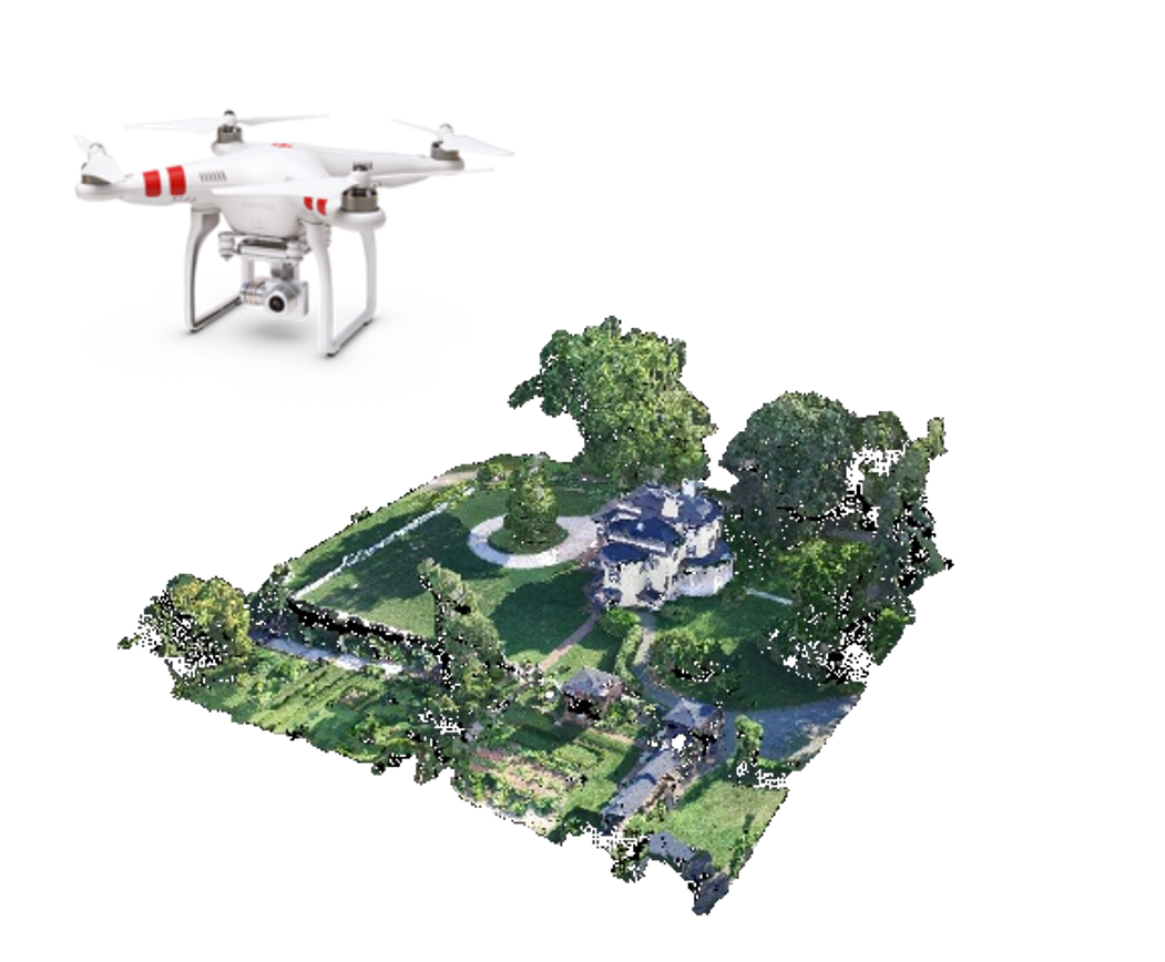 - デジタルカメラを搭載したドローンや UAV により撮影された画像から、オルソ画像や DSM、DTM、3D 点群データといった 2D または 3D の GIS データを生成できます。