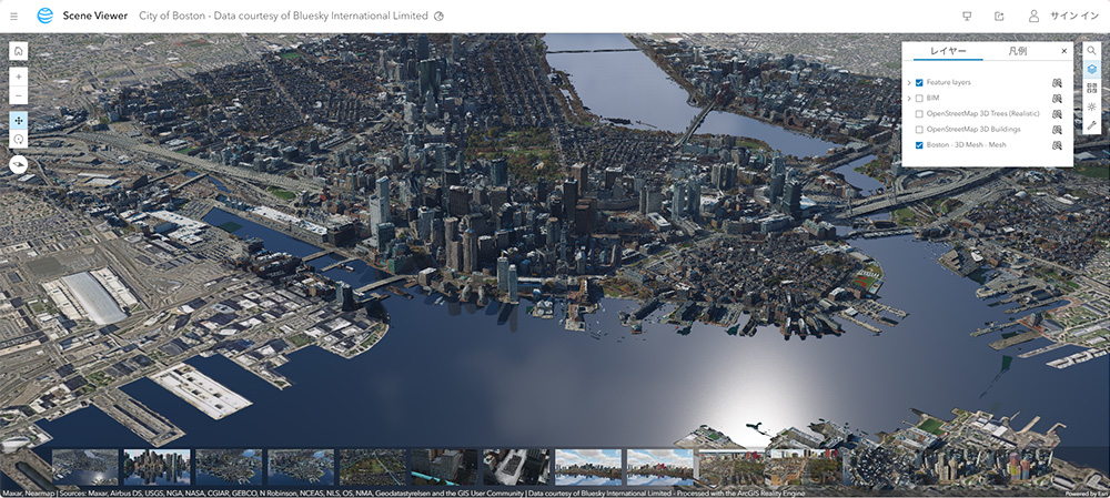 ArcGIS では、現実世界の空間情報を高精度でデジタル化するリアリティキャプチャ機能を提供し、デジタルツインの構築を支援します。衛星画像、航空写真、ドローン、LiDAR など、多様なセンサーから取得したデータから高精度な 3D モデルを生成し、都市、施設、インフラの状態をリアルに再現することが可能です。