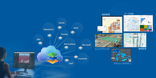 ArcGIS は、他の業務システムやIT基盤と柔軟に連携できる設計により、組織全体の情報活用を加速させます。Microsoft、Autodesk、Adobe、SalesforceなどのグローバルIT企業のソフトウェア/サービスに対応したアドオンや REST API の提供により、他のシステムや Web サービスと容易に連携したり、カスタムアプリを開発できます。