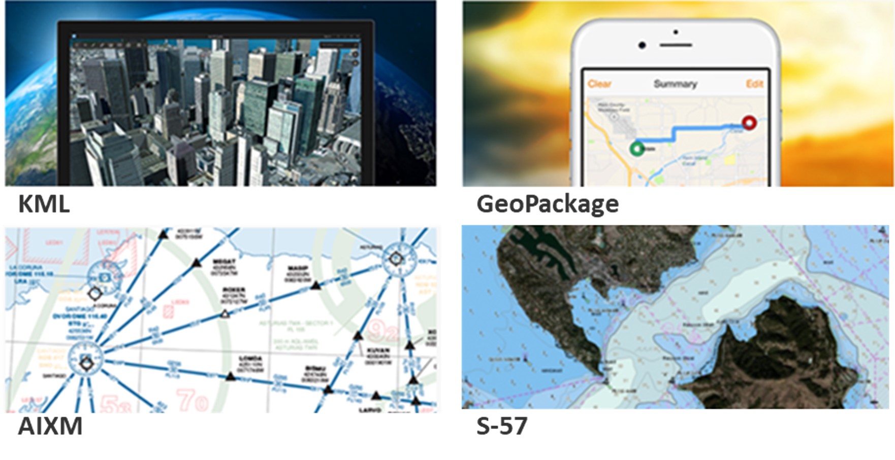 ArcGIS は多様な形式のデータの入出力に対応します。KML、GeoPackage などの汎用的なデータ形式、デジタル航空フォーマットである AIXM、電子航海図と海洋環境の標準である S-57 といった主要なフォーマットの利用を支援します。