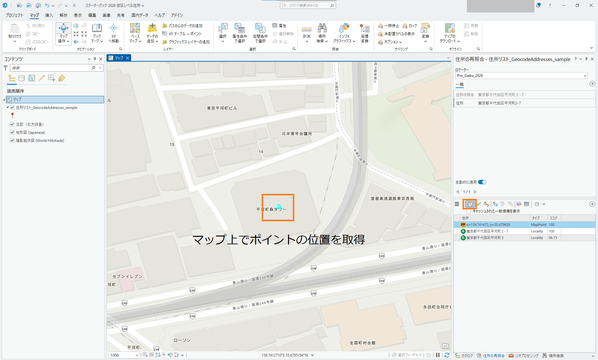 入力した住所をすばやく検索し、ArcGIS Desktop 上で対応する位置を表示することなどができる機能です。
