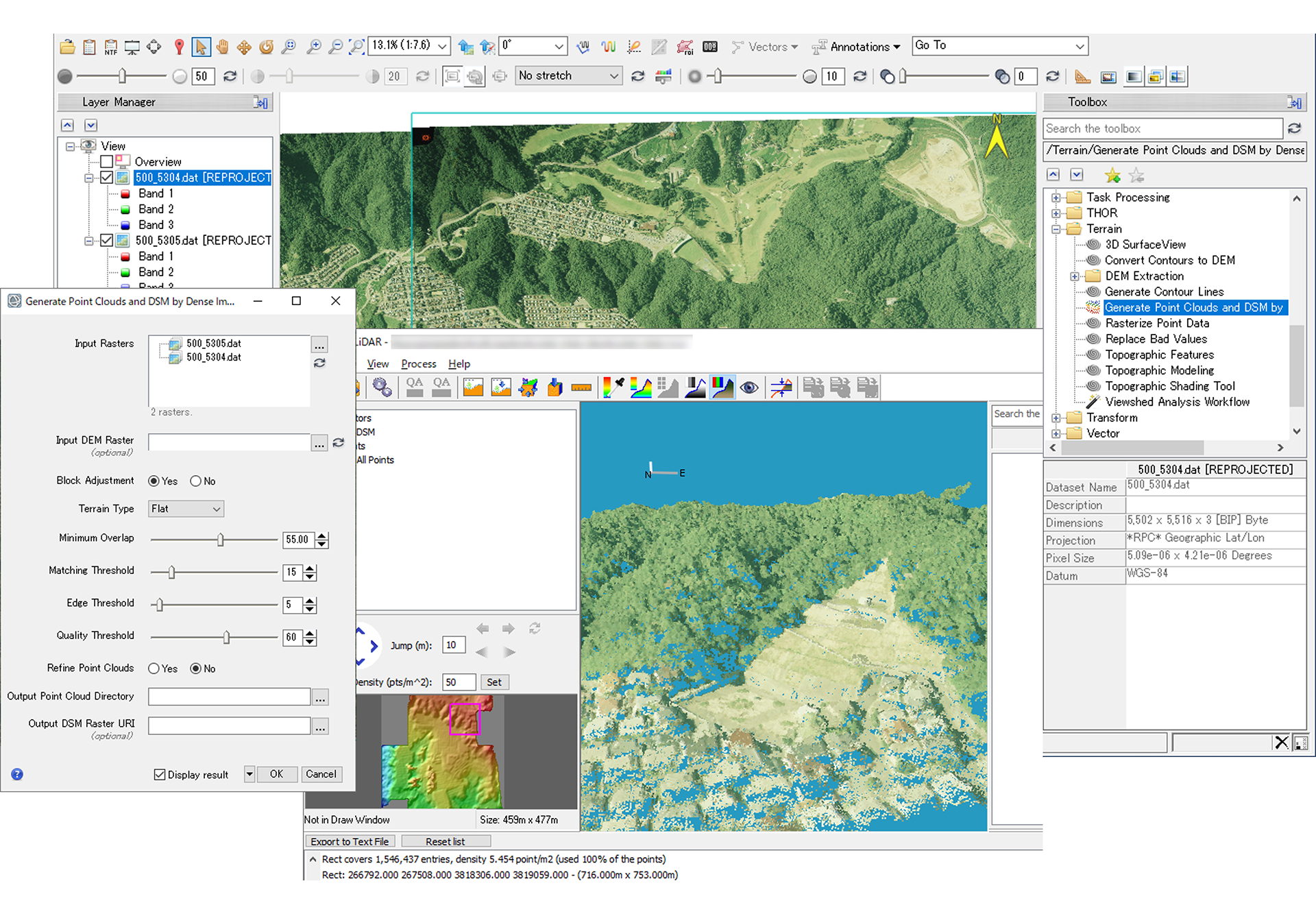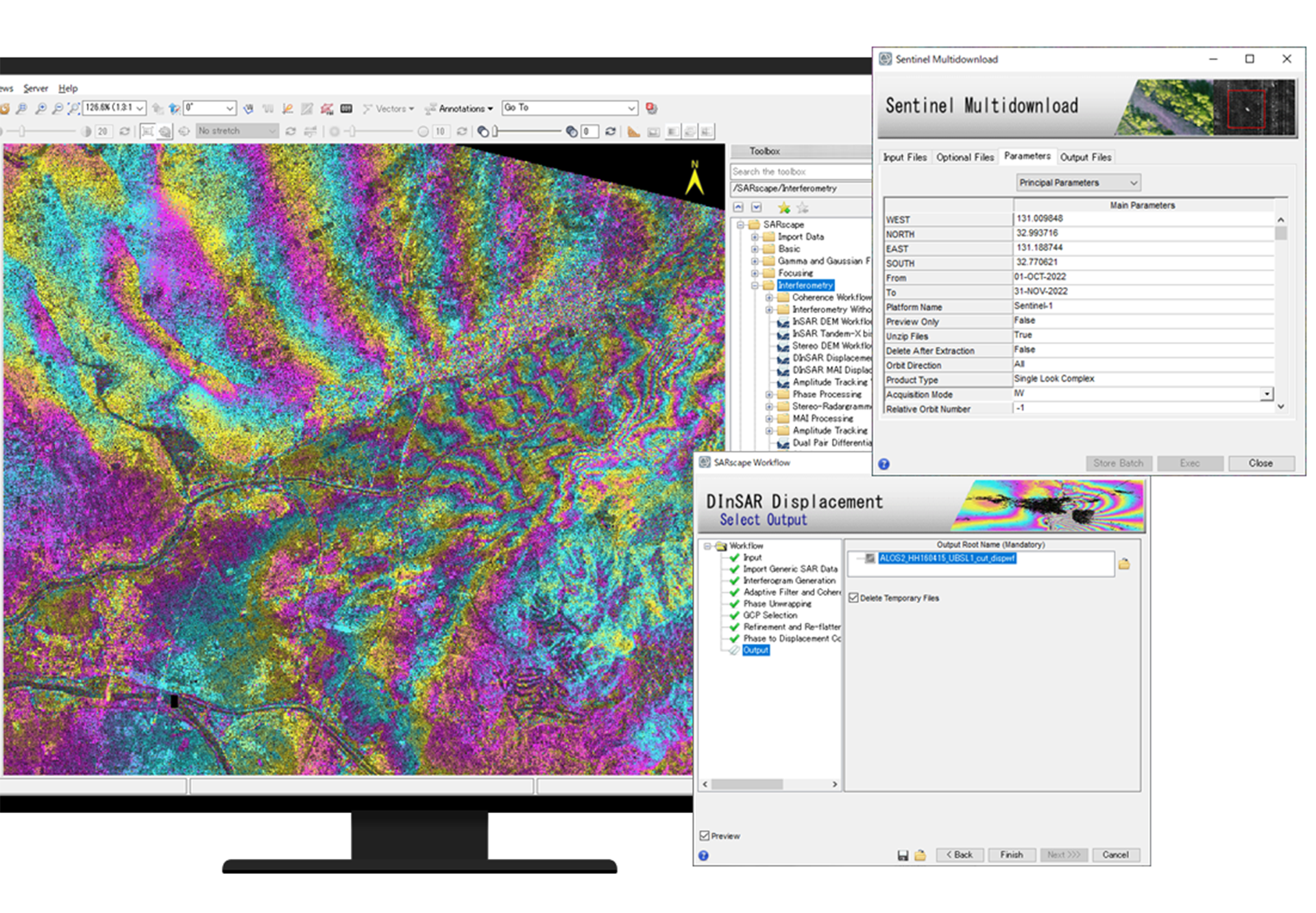 合成開口レーダ(SAR)データの読み込み、処理、解析、出力を可能にする機能です。干渉(インターフェロメトリー)処理や DEM 抽出など高度な解析処理が行えます。