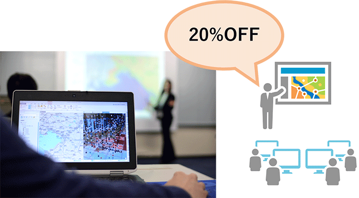 ご利用頂いている製品に該当するESRIジャパンが主催する定期トレーニングを割引価格( 20% 引)にて提供いたします。ご契約者ご本人だけでなく、ご購入・ご契約組織内の方にも割引価格が適用されます。