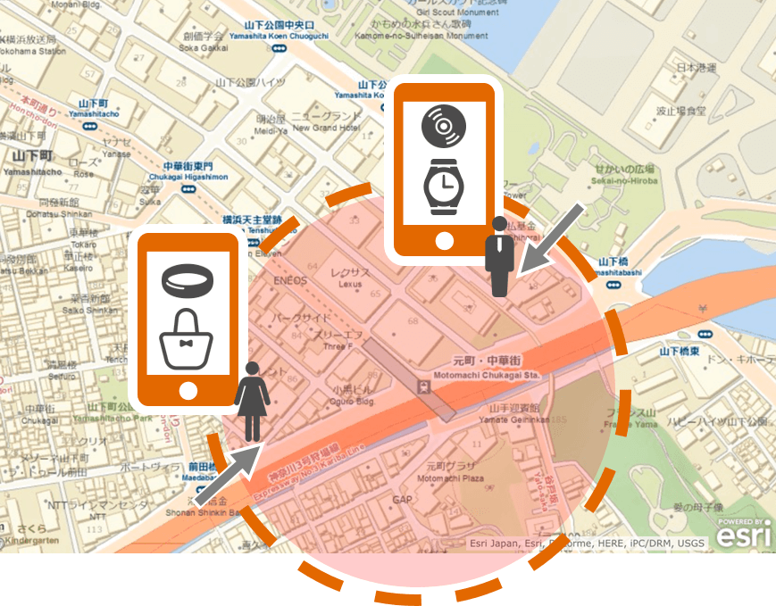 ジオフェンスとは、仮想的な境界線で囲まれたエリアを表します。ジオフェンスは、このエリアに対象が「入った / 出た」を判断するために利用できます。自店舗周辺のエリアをジオフェンスとして設定し、顧客等が所有するスマートフォンなどで取得できる位置情報を利用することで、自店舗の近くを顧客が通ったときにクーポンなどをメールで送信するような活用が可能です。