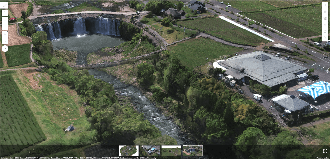 ※(有)大光電気様が大分県「原尻の滝」をドローンで空撮した画像をご提供いただき、3D データ生成に使用しました。