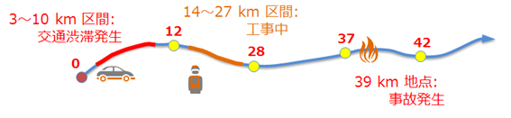 リニアリファレンスは、下図のように線分の起点からの距離を用いて、ある地点で発生している事象や交通渋滞、工事区間といった距離区間を地図上に表示し、管理するための方法です。