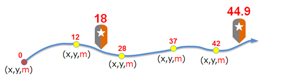 ライン フィーチャの頂点に起点からの距離すなわち M 値を格納することにより、ライン フィーチャ上の頂点以外の地点でも距離を取得することが可能になります。