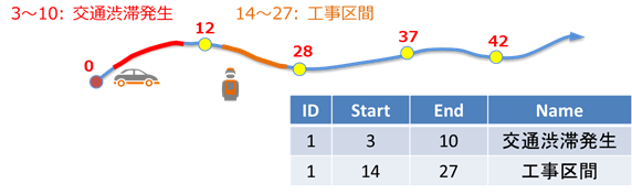 イベント テーブルには、ルートの始点を起点として何メートルから何メートル地点まで道路が渋滞しているといった範囲を情報として登録することもできますし、何メートル地点で事故が発生したといった 1 点を登録することもできます。そのような情報を登録し、ルート フィーチャクラスと関連付けることで、単一のフィーチャクラスに対し、距離に関するもとづいた複数の情報を付与することができます。