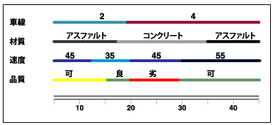 しかし、交通事故による影響区間や速度制限など、分割したフィーチャにまたがって管理したい情報などもあります。リニアリファレンスを利用することで、下図のように 1 つのルート フィーチャクラスに複数の属性セットを関連付けることができます。