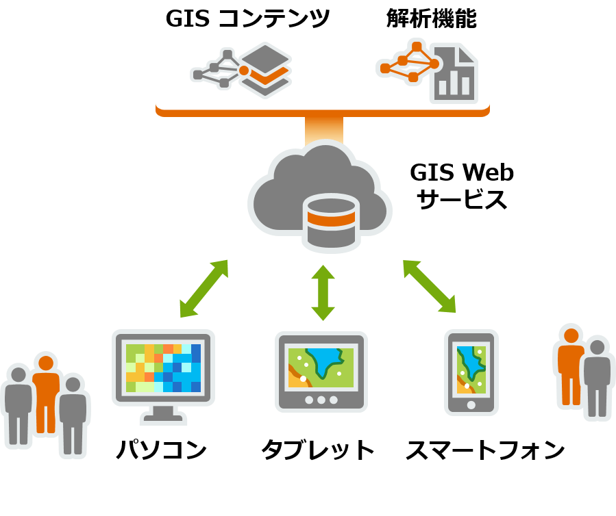たとえば、これまでデスクトップ アプリケーションで処理していた解析を、GIS Web サービスを利用して Webブラウザー上で解析することができるようになったり、以前はパソコン上(ローカル)に保存してある GIS データを USB メモリーや HDD 等に移してやりとりしていた作業が、Web 上で GIS データを共有することでデータのコピーや持ち運びの手間が不要になり、より簡単に、よりスピーディに作業を進めたりすることが可能になっています。